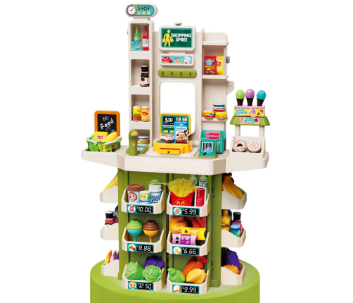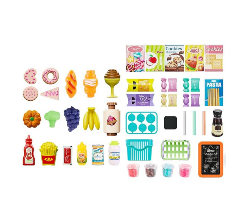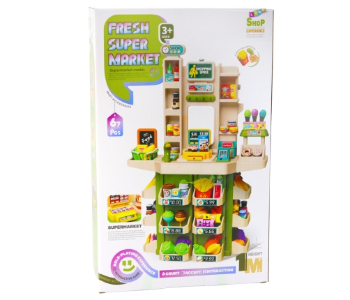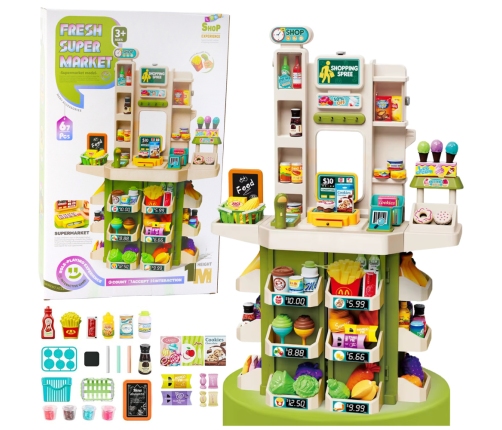 Fresh Super Market is a modern, interactive educational toy that will turn a child's room into a realistically recreated supermarket. The set contains as many as 67 elements, including imitations of food products, drinks, packaging, vegetables and fruits, as well as a cash register with buttons, a price reader, a payment terminal and display shelves, thanks to which the child can take on the role of both a seller and a customer.