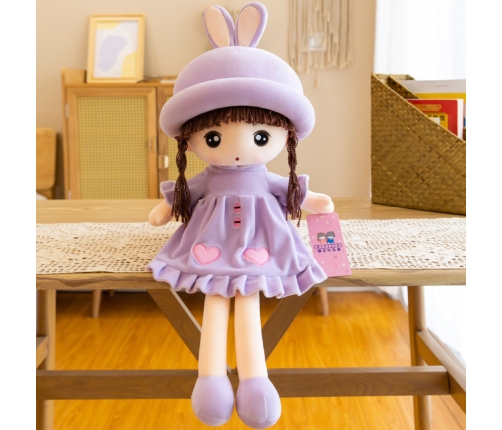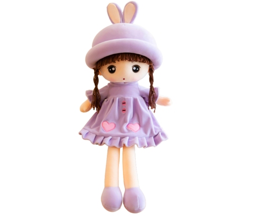 This charming plush rag doll in a purple dress is a toy that immediately attracts attention with its originality and sweet appearance. The doll is dressed in a delicate, frilly dress with heart appliqués and buttons, which drapes beautifully during play. Her large hat with ears resembling rabbit ears adds a fairy-tale character to the whole thing.