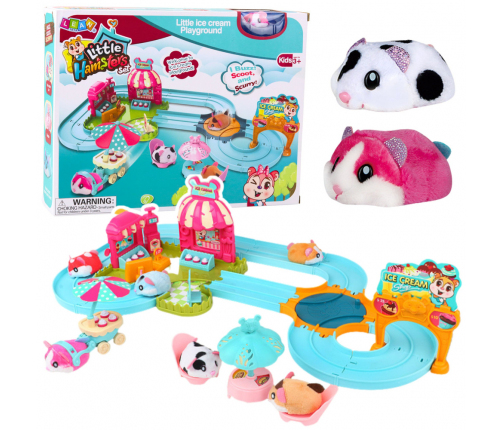 The set includes numerous accessories, such as a table with an umbrella, ice cream desserts or a cart for transporting delicacies. The child can watch how the hamster, acting as a waiter or delivery man, delivers ice cream to customers or traverses the track along its own paths. All elements have been made with attention to detail, and the soft fur of the hamster encourages interaction.