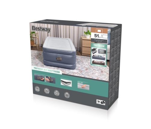 Equipped with a built-in electric pump, it allows for instant inflation - the whole process takes about 3 minutes. The mattress has a stable, raised structure, thanks to which use is more comfortable and getting up is easier.