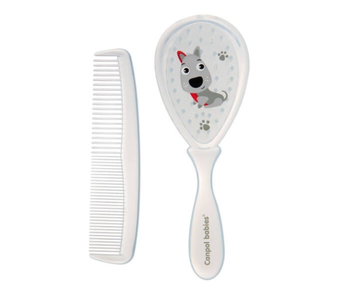 Szczotka do włosów z grzebykiem do codziennej pielęgnacji włosów dziecka. Grzebień posiada zaokrąglone ząbki, które nie podrażniają wrażliwej skóry malucha. Szczotka z twardym, sztucznym włosiem delikatnie masuje główkę dziecka, nie elektryzując włosów. Zestaw dostępny w kilku wariantach kolorystycznych.