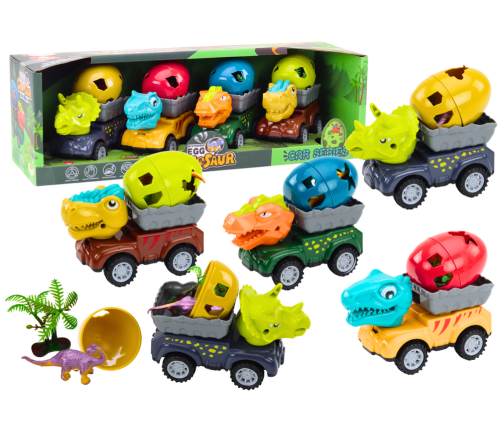 This toy set is a real treat for little dinosaur and vehicle lovers! The set includes four different vehicles, each with a unique appearance and functionality. Each vehicle has a trailer with a large dinosaur egg on it. The egg is unique because it can be opened to reveal a dinosaur figure and a palm tree hidden inside, which adds even more fun to play.
