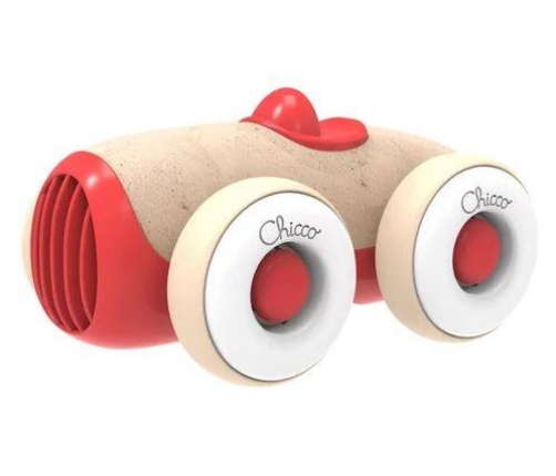 Mały samochód z kolekcji Chicco Eco+ z obracającymi się kołami, wykonany z plastiku pochodzącego z recyklingu i bioplastiku z ligniną, którym dziecko może bawić się w łatwy i bezpieczny sposób.