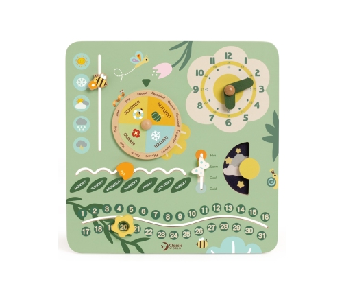 Drewniana tablica rozwija zdolności manualne, koncentrację i cierpliwość - dziecko uczy się odczytywania godzin, dni tygodnia, dat i pór roku. Może także poznawać zmieniającą się pogodę i temperaturę.