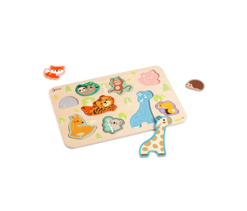 Drewniana układanka ze zwierzętami to edukacyjna zabawka dla dzieci. Maluch dopasowuje kolorowe zwierzątka, takie jak żyrafa czy lisek, do miejsc na tablicy z motywami leśnymi.