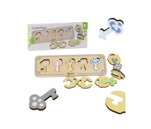 Drewniany Zamek z Kluczami od marki CLASSIC WORLD to sensoryczna układanka dla malucha. Gra polega na dopasowaniu pięciu unikalnych kluczy do pasujących zamków, klucze można również schować do tablicy która posiada miejsce na każdy z kluczy. Doskonały do koordynacji ręka-oko małych dzieci i poznania graficznego.