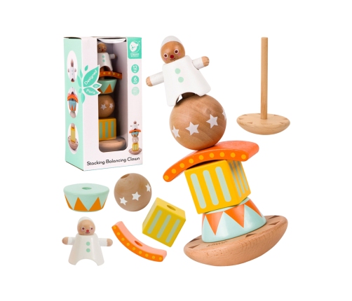 - - Zestaw zawiera cztery kolorowe drewniane elementy, stojak z palikiem do układania klocków, oraz wesołego klauna.
