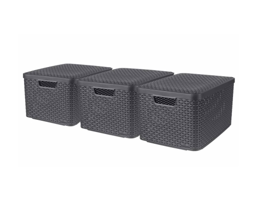 Šīs Curver Style kastes ar dekoratīvu rotangpalmas faktūru piešķirs jūsu interjeram unikālu izskatu. Komplektā ir iekļautas 3 kastes. Kastēm ir ērts vāks, kas pasargās tajā ievietotās lietas no putekļiem, turklāt tās nebūs redzamas. Tām ir arī ērti rokturi, un tās var novietot vienu uz otras - gan ar vākiem, gan bez.