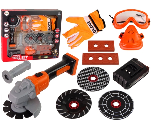 The grinder has a red handle with elements of black, by pushing a button on the handle, the disc starts to rotate. It is made of plastic, which is responsible for the low weight of the individual components. The set also includes three interchangeable discs, variously finished. A mask and goggles protect against dust, so keep that in mind!