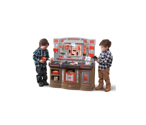 Od obróbki drewna po ciesielstwo - małe dzieci mają wszystko by budować i majsterkować w swoim pierwszym warsztacie od cenionego producenta zabawek marki Step2. W zestawie znajduje się aż 45 akcesoriów dzięki, którym można zrealizować każdy dziecięcy projekt. Zbuduj dołączony do zestawu domek dla ptaków, pomaluj go wodą za pomocą dołączonego zestawu malarskiego i zobacz jak zmienia kolor! Włącz górne światełko by oświetlić miejsce zabawy. Warsztat zawiera wiele skrytek i pojemniczków, wiertarka wydaje dźwięki jak prawdziwa, na blacie znajduje się ruchome, sprężynowe imadło - to wszystko sprawia, że to idealny zestaw dla małych budowniczych. Podczas zabawy małe dzieci rozwijają swoje umiejętności motoryczne, ponadto duże rozmiary stołu warsztatowego pozwalają, aby ćwiczyć umiejętności społeczne podczas zabawy towarzyskiej z przyjaciółmi.