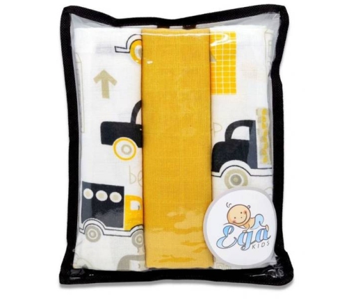 Komplet przewiewnych pieluszek muślinowych. W skład kompletu wchodzą 3 pieluszki muślinowe- dwie we wzorki i jedna kolorowa. Muślin charakteryzuje się lekkością i wyjątkową miękkością, której nabiera z każdym praniem, a dzięki tym właściwościom idealnie sprawdza się już od pierwszych dni życia. Zestaw zapakowany jest w transparentną torbę zapinaną na zamek.