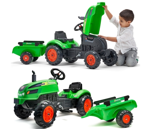 Traktor na pedały z przyczepą Green Pedal X Tractor to spełnienie marzeń niejednego małego traktorzysty i budowniczego. Starannie wykonany, z dbałością o najmniejszy szczegół! Żaden Prawdziwy Farmer by takim nie pogardził. Pojazd wykonany z najwyższej jakości tworzywa przeznaczony dla dzieci w wieku 2 lat. Pojazd jest wyposażony w odpinaną przyczepę z panelami oraz kierownicę z klaksonem. Koła traktorka zostały wykonane z wysokiej jakości plastiku i nie są uciążliwe w użytkowaniu.