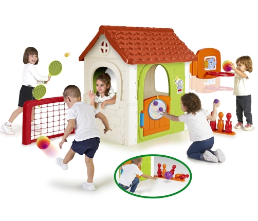 Представляем FEBER Многофункциональный игровой домик – игрушку, которая обеспечивает веселье и развлечения! Это первый игровой домик, который включает шесть игр, помогающих вашему ребенку забыть о скуке. Включенные игры: кегли, игры с ракетками, футбол, баскетбол (с регулируемым кольцом) и мишень для мячей на липучках. После завершения игр все можно сложить, тем самым устраняя беспорядок!