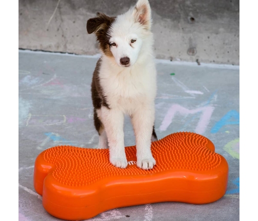 Šī kaula formas suņu līdzsvara platforma padarīs jūsu mājdzīvnieka trenēšanu daudz jautrāku. Treniņi ar K9FITbone ir lielisks veids, kā mazināt stresu un sadedzināt liekās kalorijas. Pievienojot vairāk vai mazāk gaisa, jūs varat vienkārši pielāgot vingrojumu grūtības līmeni. Uz platformas gan mazi, gan lieli suņi varēs saudzīgā veidā stiprināt un tonizēt visu ķermeni. Mazi suņi var novietot visas četras ķepas uz vienas platformas, bet lielajiem suņiem nepieciešamas 2 platformas – viena priekšējām kājām un viena aizmugurējām kājām. Pateicoties profesionālas kvalitātes materiālam, platforma nodrošinās labu saķeri, kā arī tā būs noturīga pret suņu nagu radītiem bojājumiem. Līdzsvara platformā ir arī sensori izciļņi nervu stimulēšanai.