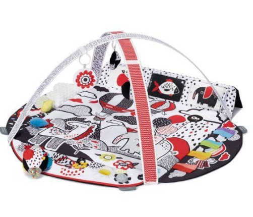 Dołączone karty można włożyć za specjalną folię, znajdującą się na boku maty. Przedstawiają różne kształty i utrzymane są w kontrastowej stylistyce. Dziecko z ciekawością będzie je oglądać, ćwicząc koncentrację. Bok maty można podnieść, by zachęcić dziecko do podnoszenia głowy i ćwiczenia mięśni karku.
