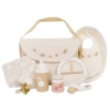 - В комплекте с куклой поставляется соска на цепочке с прищепкой. Когда малышка ее теряет, она начинает плакать, также кукла произносит слова мама и папа.