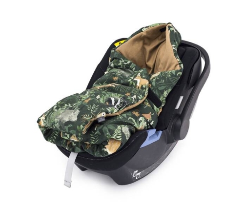 Otulacz do fotelika wyposażony jest w otwory na trzy i pięciopunktowe pasy bezpieczeństwa. Długie pionowe otwory zabezpieczone rzepem pomogą dopasować kocyk do każdego fotelika. Zapinany jest na szeroki rzep z dużym obszarem regulacji, a w górnej części posiada zapinany kapturek, który otula i chroni główkę.