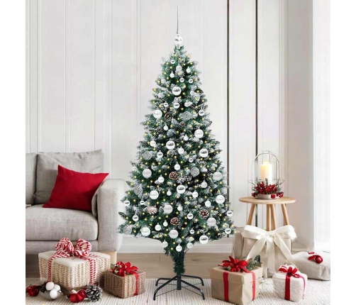 PVC mākslīgais Ziemassvētku koks apvieno tradicionālo šarmu ar LED apgaismojuma ērtībām un modernitāti. Tas ir izstrādāts gan iekštelpām, gan aizsargātām āra vietām. Koka konusveida struktūra, izrotāta ar priedes čiekuriem un sniegu, piešķir svētku sajūtu, ideālu maģiskai atmosfērai tavā dzīvojamā istabā, dārzā vai terasē. Šis skaistais dekors aicina Ziemassvētku garu jebkurā vidē.