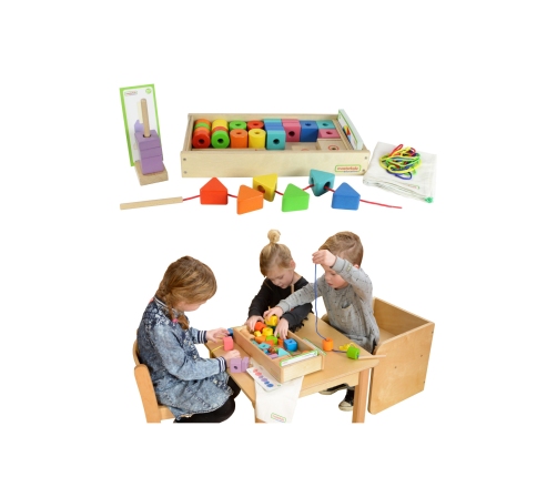 Zestaw do sznurowania marki Masterkidz to komplet różnorodnych, kolorowych koralików, oraz sznurków. Jest to jeden z 3 dostępnych zestawów do sznurowania marki Masterkidz. Można go dowolnie łączyć z pozostałymi dwoma, żeby zabawa była jeszcze ciekawsza i różnorodna.