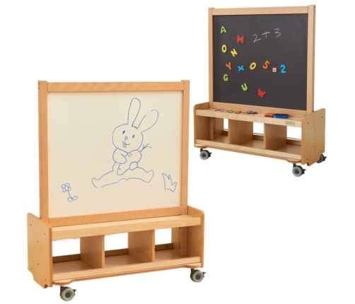 Доска размещена на удобном деревянном штативе, который прекрасно подходит для школьных и детских садов, а также облегчает переноску и хранение дома. Штатив имеет место для хранения губок, маркеров, мелков и магнитов для прикрепления к доске.
