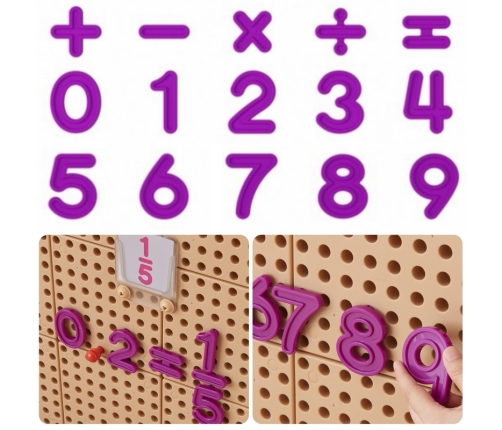 Zestaw Cyferek 82 Elementów Do Nauki Liczenia to komplet, który jest doskonałym narzędziem do nauki matematyki dla dzieci. Zawiera 40 cyfr oraz symbole działań matematycznych i równania, co umożliwia tworzenie prostych działań arytmetycznych. Elementy zestawu są odpowiednio duże, co sprawia, że łatwo je trzymać i dopasowywać, a ich fioletowy kolor przyciąga uwagę. Zestaw doskonale pasuje do ścianek STEM. Pomaga w nauce liczenia, rozumienia liczb i wykonywania podstawowych działań matematycznych, takich jak dodawanie, odejmowanie, mnożenie i dzielenie. To świetne narzędzie do wspierania rozwoju umiejętności matematycznych u młodych uczniów.
