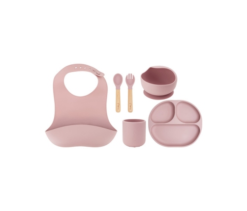 W skład zestawu MoMi AMI wchodzi: miseczka oraz trójdzielny talerzyk z przyssawką, kubek, łyżeczka i widelec z drewnianymi rączkami oraz śliniak z kieszonką. Silikonowe naczynia można myć w zmywarce oraz używać do podgrzewania pokarmu w kuchence mikrofalowej. Zestaw MoMi AMI jest zapakowany w kolorowym pudełku, dzięki czemu idealnie nadaje się na prezent.