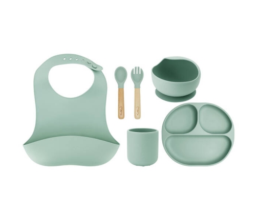 W skład zestawu MoMi AMI wchodzi: miseczka oraz trójdzielny talerzyk z przyssawką, kubek, łyżeczka i widelec z drewnianymi rączkami oraz śliniak z kieszonką. Silikonowe naczynia można myć w zmywarce oraz używać do podgrzewania pokarmu w kuchence mikrofalowej. Zestaw MoMi AMI jest zapakowany w kolorowym pudełku, dzięki czemu idealnie nadaje się na prezent.