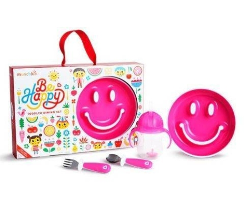 Munchkin Zestaw Upominkowy z Talerzykiem, Sztućcami i Kubkiem pozwoli dziecku w przyjemny sposób rozpocząć naukę samodzielnego jedzenia. Sztućce Raise skonstruowano w taki sposób, by odłożone nie dotykały blatu. Dzięki temu nie brudzą się (i otoczenia). Talerz Smile 'n Scoop szerokim uśmiechem zachęca do jedzenia a dzięki przyssawce stabilnie siedzi na swoim miejscu. Kubeczek ze słomką AnyAngle zabezpiecza przed rozlewaniem. Można z niego pić pod dowolnym kątem dzięki obciążnikowi zamontowanemu wewnątrz.
