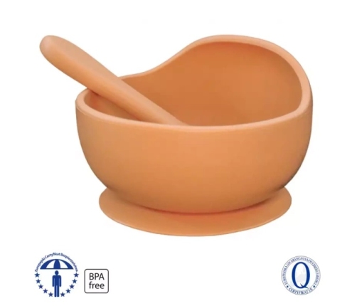 Silikonowa miseczka z łyżeczką pomaga rozwijać umiejętności motoryczne u dzieci.