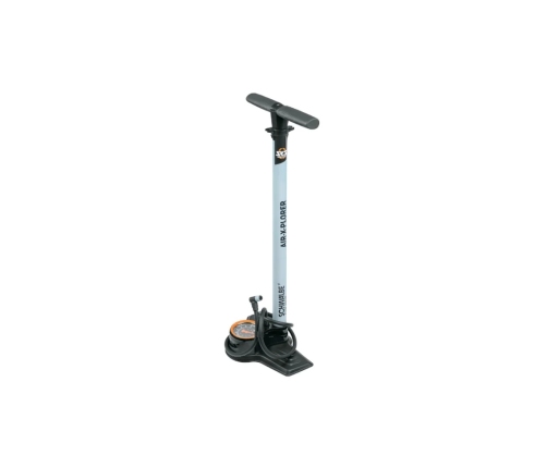 Air power in an SKS/Schwalbe design:The tried and tested AIR-X-PLORER comes in a unique look and is equipped with the SKS CLIK TEC valve head. This can be easily attached to the new Schwalbe Clik valve with an audible click. Other features of the pump include the large precision pressure gauge, the sturdy stanchion tube and the ergonomically shaped handle.Including a valve conversion kitThe rubberised bicycle pump head can be operated effortlessly with just two fingers and pumping becomes child’s play! Signs of wear and loss of pressure while removing the valve are now a thing of the past and the volume flow rate is also 50% higher than for Presta valves. The SKS floor pump is supplied with two valve inserts for retrofitting Presta and Dunlop valves. 2 valve inserts Presta 2 valve inserts Dunlop valve 1 valve tool 4 dust caps.Technical specifications:Base: MetalHandle: Soft-touch, plasticCylinder: steelPressure gauge: bottom-mounted, analog up to 10 bar / 144 PSIHose: 1200 mmMax. pressure: up to 10 bar (144 PSI)Stroke: 476 cm3Valve: SCV ( Schwalbe Clik Valve)Height: 710 mmColor: black/sky blue