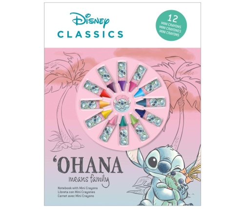 12 coloring sheets with Stitch illustrations 12 mini crayons in various colors A convenient package, perfect for storage and travel