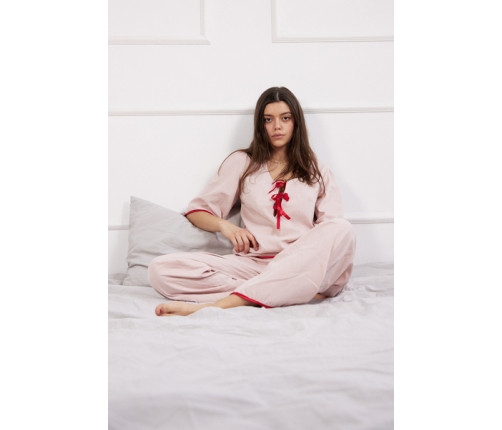W skład zestawu wchodzą luźna koszula i spodnie. Koszula z szerokimi rękawami i delikatnymi bufkami na ramionach, a jej związywany na kokardki dekolt pozwala na karmienie piersią jeśli jesteś mamą. Krawędzie zdobi kontrastująca czerwona lamówka.