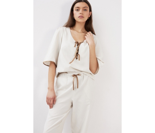 W skład zestawu wchodzą luźna koszula i spodnie. Koszula z szerokimi rękawami i delikatnymi bufkami na ramionach, a jej związywany na kokardki dekolt pozwala na karmienie piersią jeśli jesteś mamą. Krawędzie zdobi kontrastująca złoto-brązowa lamówka.
