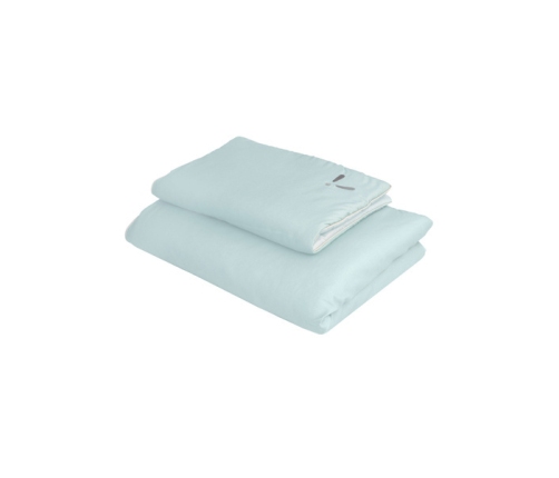 Delikatne, bezpieczne dla skóry niemowlęcia powłoczki z gładkiej bawełny satynowej wypełniliśmy hipoalergicznym włóknem poliestrowym, uzyskując lekką kołderkę (80 x 100 cm) i jeszcze lżejszą płaską poduszeczkę (40 x 60 cm).
