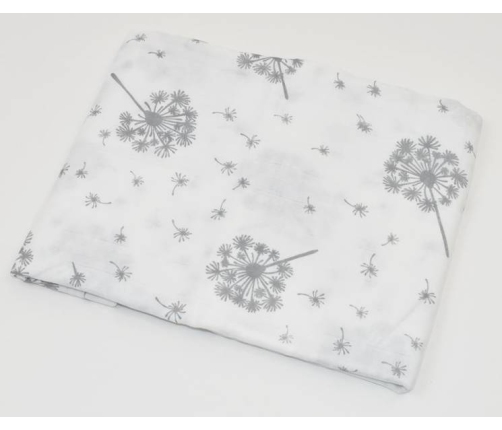 Tetrowa pieluszka posiada print wykonany w przyjemnych dla oka kolorach z motywem dmuchawców.