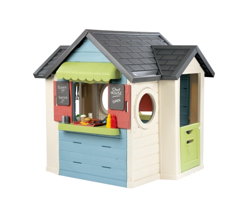 - - Funkcjonalna kuchnia: Domek wyposażony jest w lodówkę, piekarnik, kuchenkę gazową, zlew z kranem oraz kasę fiskalną z czytnikiem kart. To prawdziwe zaplecze do zabawy w restaurację!