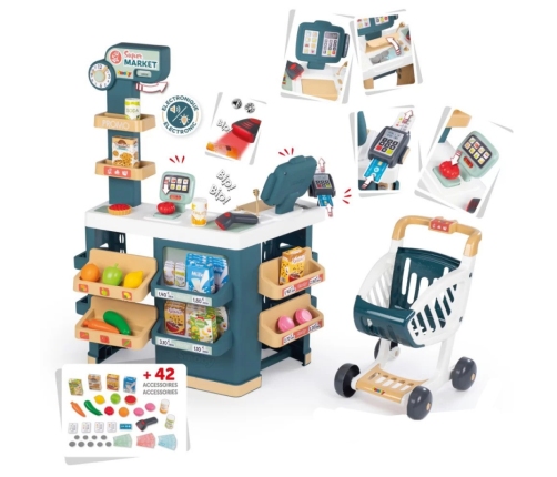Supermarket z wózkiem, elektroniczną kasą ze skanerem i wagą od Smoby to nowoczesny sklep spożywczy, w którym dzieci mogą robić zakupy i sprzedawać towary. Duży market jest wyposażony w mechaniczną wagę, na której można ważyć owoce i warzywa. W zestawie są dostępne słodycze, napoje i inne produkty spożywcze. W podliczaniu zakupionego towaru pomoże skaner ze światłem i dźwiękiem oraz kasa fiskalna z otwieranym schowkiem na zabawkowe pieniądze.