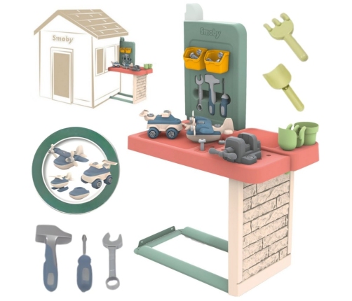 Stół roboczy z akcesoriami do domku Smoby Life – dla wszystkich, którzy chcą przekształcić swój dom zabaw Smoby w warsztat ogrodowy. Dzieci od 2. roku życia mogą śmiało „majsterkować”, uczyć się nowych umiejętności manualnych i bawić się, a dzięki 39 elementom narzędziowym, takim jak młotek czy śrubokręt. Przestronna powierzchnia robocza oraz półki sprawiają, że porządek i organizacja narzędzi stają się łatwe i przyjemne. W zestawie znajdują się także zabawki do składania jak auto i helikopter, które dodatkowo pobudzają kreatywność i planowanie. Solidna, UV odporna konstrukcja z dużą zawartością materiałów po recyklingu gwarantuje trwałość i świetną zabawę na świeżym powietrzu przez wiele sezonów!