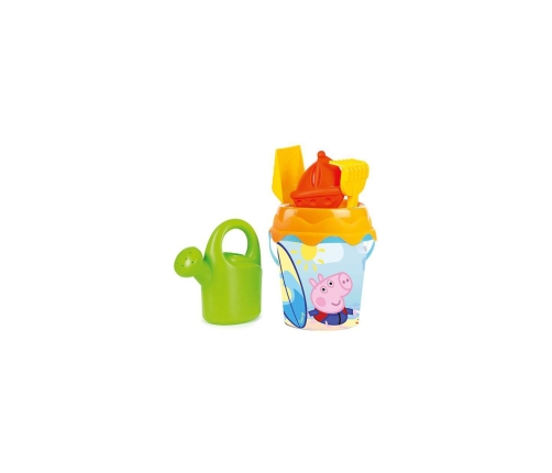 Zestaw do piasku z motywem Świnki Peppy marki Smoby to świetnie uzupełnienie każdej piaskownicy. W skład zestawu wchodzi wiaderko, ozdobione wizerunkiem postaci George, sitko które pełni również funkcję przykrywki, łopatka, konewka, grabki i czerwona łódka. Pokrywka wiaderka posiada specjalne otwory, w które można włożyć grabki i łopatkę.