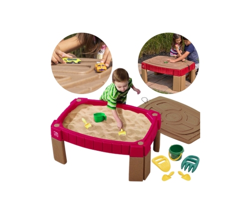 Stół do piasku podwyższany z przykrywą to idealne uzupełnienie wyposażenia każdego placu zabaw. Piaskownica umieszczona jest na czterech nogach, dzięki czemu możemy ją w łatwy sposób przemieszczać. Idealna do zabawy na zewnątrz jak i wewnątrz domu. W piaskownicy możemy umieścić tradycyjnie piasek i dzięki pokrywie z elastycznymi opaskami możemy zabezpieczyć piasek przed zabrudzeniem. Zamiast piasku możemy również umieścić w piaskownicy groch lub makaron. Idealne rozwiązanie do zabaw rozwijających zdolności sensoryczne u dzieci. Na pokrywie wyrzeźbiony został tor, na którym nasza pociecha może się bawić swoimi ulubionymi małymi pojazdami, co niewątpliwie jest dodatkową atrakcją produktu. Do zestawu dołączone zostało wiaderko, dwie łopatki i 2 pary grabi. Produkt przeznaczony dla dzieci powyżej 2 roku życia.