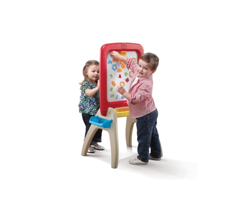 Podwójna tablica Step2 dla maluchów - z jednej strony tradycyjna do pisania kredą, a z drugiej markerem oraz możliwością przyczepiania piankowych, magnetycznych literek, cyferek i symboli. Łącznie w zestawie znajdziemy aż 94 elementy. Przyczyni się do tworzenia dziecięcych dzieł sztuki, oraz pomoże starszakom w nauce. Mali artyści mogą wykazać się kreatywnością, poprawiając swoje umiejętności motoryczne podczas pisania, rysowania i umieszczania magnesów. Wymagając minimalnego montażu dla dorosłych, sztaluga szybko się ustawia i leży płasko w celu łatwego przechowywania. Wyprodukowano w USA i niektóre importowane części.
