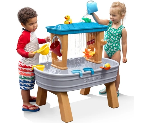Wszechstronna zabawa w wodzie zaczyna się od uroczego dziecięcego stołu wodnego. Spraw sobie przyjemność dzięki zabawie w wodzie. Dwustronna taca tworzy realistyczny efekt deszczu – wystarczy wlać wodę, aby zabawa się zaczęła! Woda z tacy umieszczona na górze tworzy realistyczny efekt deszczu. Z jednej strony przelewa się także ona do wiadra które po napełnieniu się obraca i wylewa wodę, zaś z drugiej strony jest rynienka która kieruje wodę wprost na wirujący wiatraczek. Zestaw posiada także wyskocznie dla zwierzątek, uchwyt na wiaderko oraz sitko. Całość ląduje w brodziku na samym dole.
