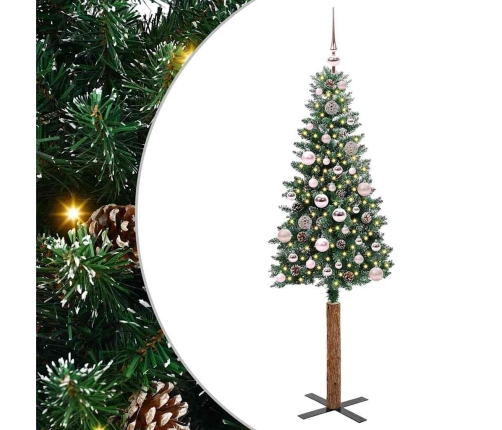 - Dekoratīvs ar priežu čiekuriem un ornamentālajām bumbiņām, dzīvotspējīgi zari ar saldētu sniegu, īsta koka stumbrs