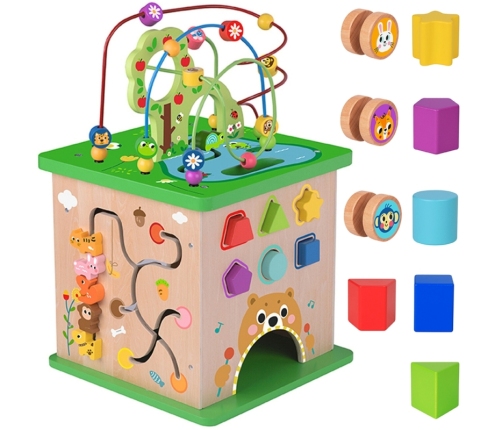 - - zabawka składa się z 5 różnych form aktywności: pętlę motoryczną, sorter, obracane klocki ze zwierzątkami w labiryncie , koła zębate i labirynt ze zwierzątkami i odpowiednią drogą do dopasowania względem kolorów,