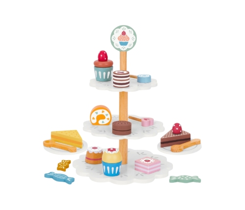 W komplecie znajduje się aż 18 drewnianych kawałków ciasta oraz dodatkowe akcesoria, takie jak talerzyki i łyżeczki, które pozwalają w pełni oddać się zabawie w serwowanie deserów. Zabawa pomaga rozwijać umiejętności społeczne, komunikację oraz kreatywność, zachęcając dzieci do wcielania się w rolę gospodarzy i serwowania słodkich przysmaków.