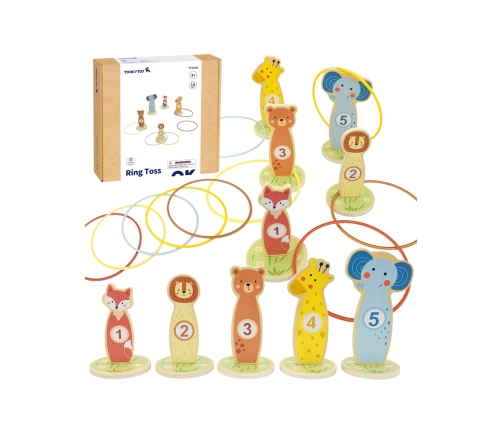Rzut do celu obręczami marki Tooky Toy to gra zręcznościowa, która dostarcza wielu godzin świetnej zabawy, jednocześnie rozwijając koordynację wzrokowo-ruchową. W zestawie znajduje się 5 postaci zwierząt umieszczonych na podstawkach - tygrys, niedźwiedź, lew, słoń i żyrafa oraz 5 pierścieni. Drewniane elementy można układać w dowolnej konfiguracji, w miarę postępów zwiększać poziom trudności , umieszczając kółka dalej, co pozwala na kreatywne projektowanie własnej wersji gry. Gra doskonała do wspólnej zabawy z przyjaciółmi i rodziną, zachęca dzieci do interakcji społecznych.