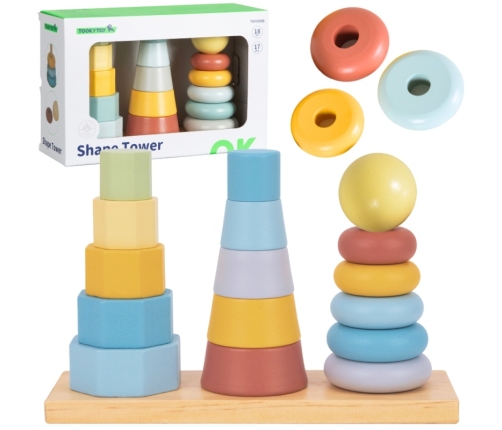 Trzy Wieże do układania firmy Tooky Toy to doskonała zabawka dla dzieci już od 18 miesiąca życia, zapewniająca długotrwałą rozrywkę. Składa się z 16 kolorowych , drewnianych klocków o różnych kształtach i rozmiarach, które można układać w wieże lub inne konstrukcje. Dodatkowo w zestawie znajduje się drewniana podstawa, na którą można układać trzy kolorowe piramidy. Zabawa ta nie tylko rozwija zdolności motoryczne dziecka, ale także pomaga mu poznać różne kształty, kolory i rozwija umiejętność klasyfikacji według rozmiaru. Pudełko, które jest jednocześnie opakowaniem służy do przechowywania, wyposażone w magnes, co zapewnia wygodne zamykanie i przechowywanie wszystkich elementów zestawu.