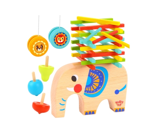 Kolekcja Gier to wyjątkowy zestaw gier od renomowanej marki zabawek drewnianych Tooky Toy, który zaciekawi dzieci i nie pozwoli się nudzić przez długi czas. Uroczy słonik stał się bazą do ułożenia studni, lub zbudowania wieży. Patyczki można użyć, również do zabawy w bierki. Pozwoli na wyćwiczenie precyzji rączek i koordynacji ręka-oko. Dodatkowo w zestawie znajdują się dwa jojo, które poprawią motorykę i zręczność małych użytkowników. Stwórzcie konkurs, kto więcej razy wypuści i zawróci jojo do ręki albo zrobi lepsze sztuczki. Dogrywka? Nie ma problemu! Czyj kręciołek będzie dłużej pozostawał w ruchu ten wygrywa! Cały zestaw został wykonany z najwyższej jakości materiałów, dzięki czemu jest bezpieczny dla dzieci i środowiska.