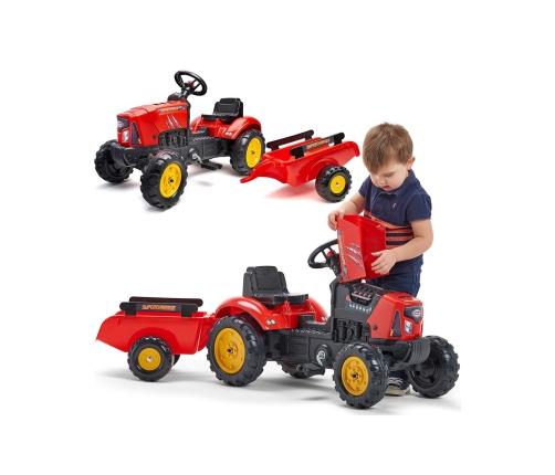 Трактор на педалях с прицепом Red Supercharger — это воплощение мечты не одного маленького тракториста. Он тщательно изготовлен, с вниманием к каждой детали! Ни один фермер не откажется от такого. Транспортное средство выполнено из высококачественных материалов и предназначено для детей от 2 лет. Оно оснащено съемным прицепом с панелями и рулем с клаксером. Колеса трактора изготовлены из высококачественного пластика. У трактора также есть открывающийся капот с имитацией настоящего двигателя.