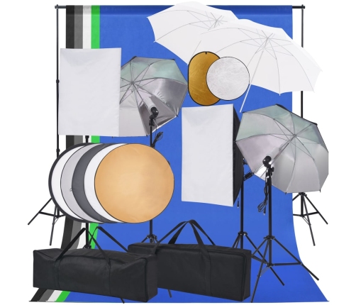 Lietussarga apgaismojuma sistēmā ietilpst divas dienasgaismas lampas ar regulējamiem trijkāja statīviem. Divi baltie un divi melnie foto lietussargi nodrošinās maigu apgaismojumu bez asām ēnām.